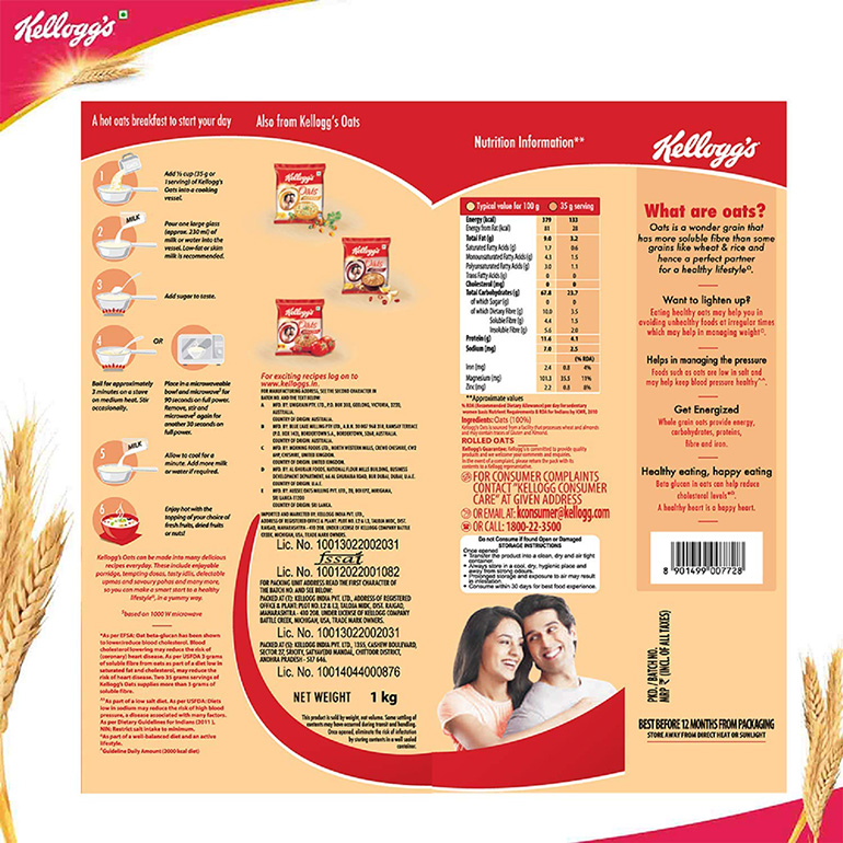 Kellogg’s Oats, Rolled Oats, High in Protein & Fibre, 1kg Pack