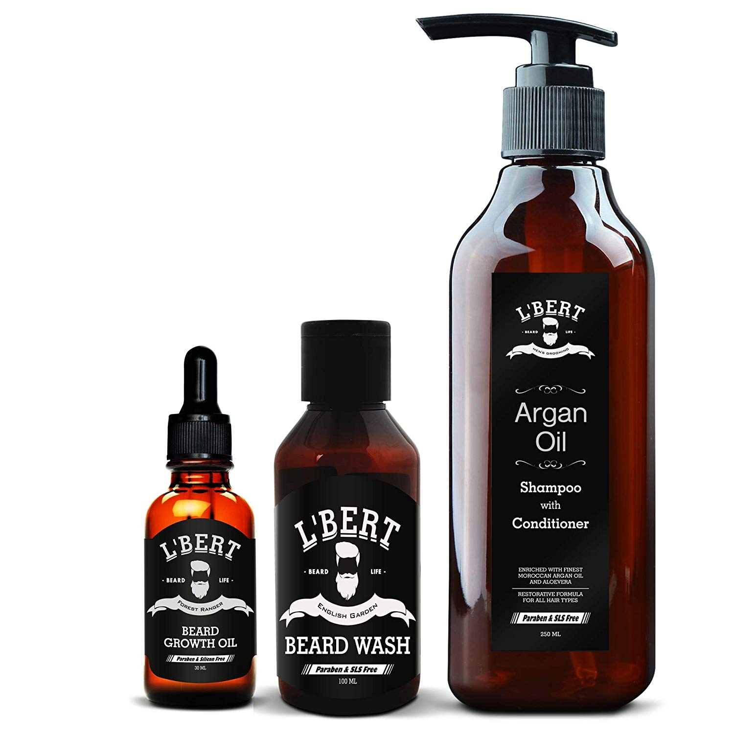 L’BERT Forest Ranger Beard Growth Oil (30ml), English Garden Beard Wash (100ml) & Moroccan Argan Oil Shampoo & Conditioner (250ml) Combo Pack for Men