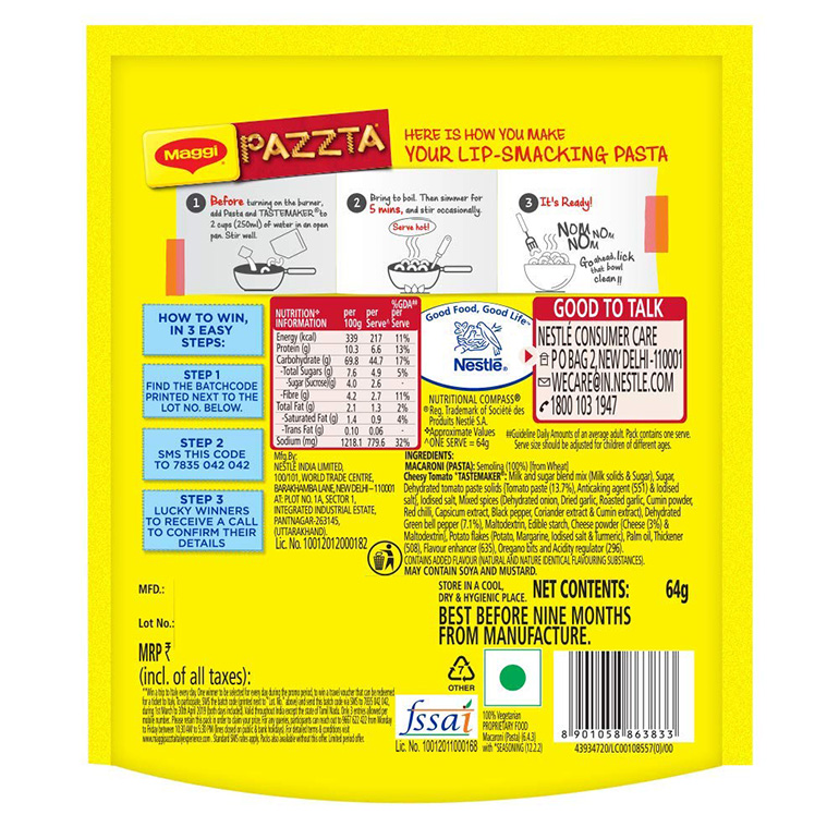 Maggi Pazzta Instant Pasta, Cheesy Tomato Twist, 64g Pouch